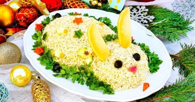 САЛАТ КРОЛИК С ВЕТЧИНОЙ КУКУРУЗОЙ И РИСОМ НА НОВЫЙ 2023 ГОД Необычный, яркий, вкусный, на праздничный стол! Салат Кролик с ветчиной, рисом и кукурузой удивит вашу семью и гостей необычным оформлением. Готовится он из простых продуктов. Сочетание ингредиентов очень гармоничное, главное выдержать пропорции. Подходит для новогоднего, пасхального стола, детям ПОШАГОВОЕ ПРИГОТОВЛЕНИЕ Время приготовления: 40 мин/ ШАГ 1: . ШАГ 2: . ШАГ 3: . ШАГ 4: . ШАГ 5: ШАГ 6: ШАГ 7: ШАГ 8: ШАГ 9: С твёрдого сыра вырежьте два небольших полуовала и отложите в сторону (это будут ушки). ШАГ 11: ШАГ 12: ШАГ 13: ШАГ 14: ШАГ 15: ШАГ 16: ШАГ 17: ШАГ 18: Такой салат в виде Кролика станет настоящим украшением Вашего Новогоднего стола. Так же приготовить его можно ко дню Пасхи. Понравится и взрослым и детям Приятного Вам аппетита!