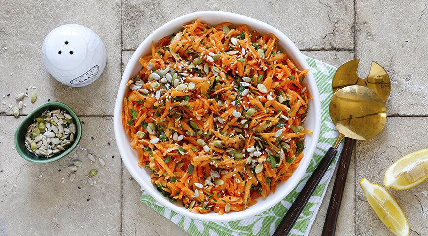 Салат из молодой морковки с петрушкой, лимоном и семечками