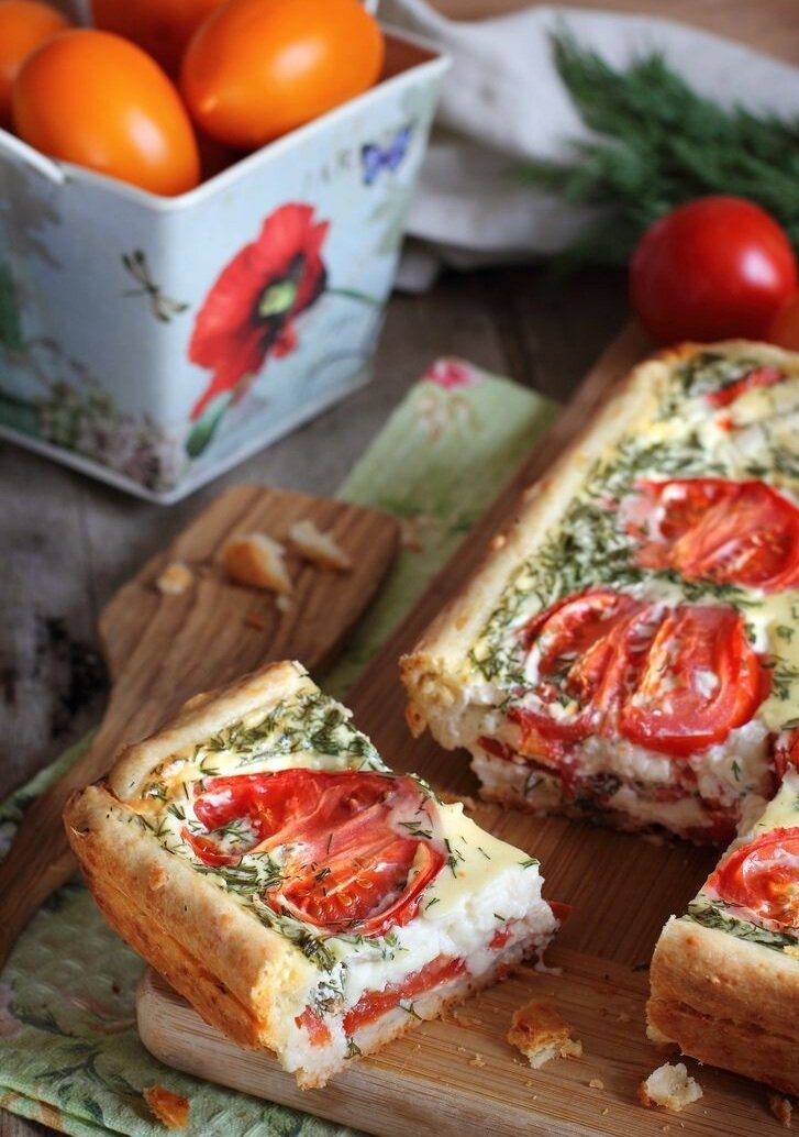 Привет, друзья ! Выходные - это прекрасный повод порадовать своих близких чем - нибудь вкусненьким, например - сырным пирогом с помидорами )) ИНГРЕДИЕНТЫ : Сыр - 200 г, Масло сливочное - 100 г, Яйца - 4 штуки, Мука - 200 г, Молотый белый перец - по вкусу, Помидоры - 7 -8 штук, Сметана - 150 г, Сливки - 100 мл, Мускатный орех, прованские или итальянские травы, свежая зелень, соль - по вкусу . ПРИГОТОВЛЕНИЕ : 1) 100 г сыра натереть на тёрке . Добавить к сыру муку, 1 яйцо, соль, масло и замесить тесто . Если тесто не собирается в шар - добавить 2 столовые ложки воды . Завернуть тесто в плёнку и убрать в холодильник на 1 час . 2) Помидоры промыть, обсушить и нарезать кружочками . 3) Взбить сметану со сливками и яйцами . Добавить специи, свежую зелень и соль по вкусу . Оставшийся сыр натереть на тёрке и добавить к яичной заливке . 4) Тесто раскатать, переложить в смазанную форму, сделать бортики . Положить помидоры и залить заливкой . 5) Выпекать в раз