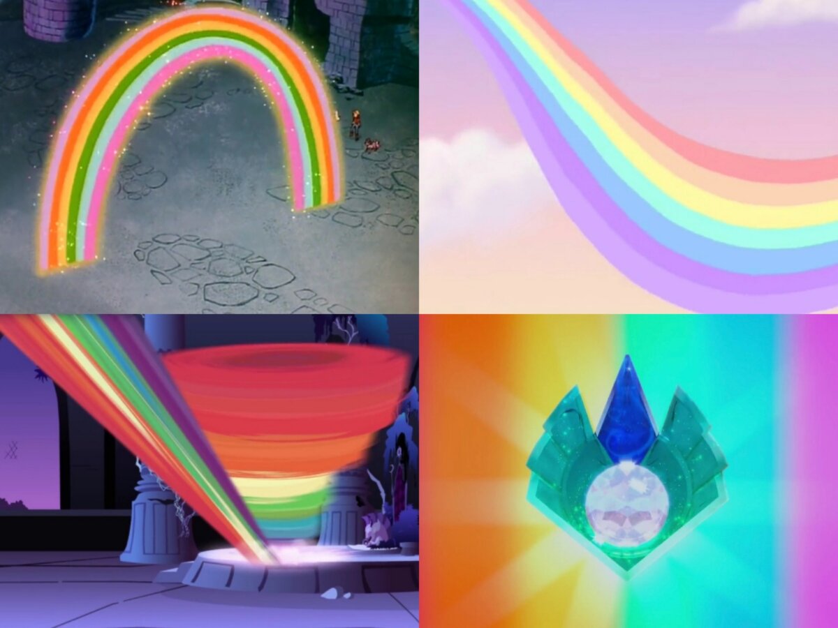 Значение радуги в первом поколении Волшебная радуга в самом первом мультфильме играла очень важную роль. Когда она не была нужна, девочка Меган хранила её в мешочке. А когда нужно было победить злодея или кого - нибудь расколдовать, она просто развязывала мешочек и радуга вылетала наружу. Злодеев радуга или не щадила, так скажем, или исправляла. А заколдованных расколдовывала. Значение радуги во втором поколении Тут радуга витала чуть ли не везде: в хвостах пони, в их снах, они перемещались по ней и даже наливали её в чай! Значение радуги в третьем поколении Центр этой радуги находился в Единорогии. По ней пони перемещались, поднимали себе настроение. А также радуга просто вимела в качестве украшения. Значение радуги (магии конечно))) в "Дружба - это чудо" А вот тут радуга даже круче её самой первой. Она исходила от Элементов Гармонии и от пегасов в виде радужного удара. В первом случае радуга появлялась при действии всех элементов и побеждала злодеев разными способами, а от радужн