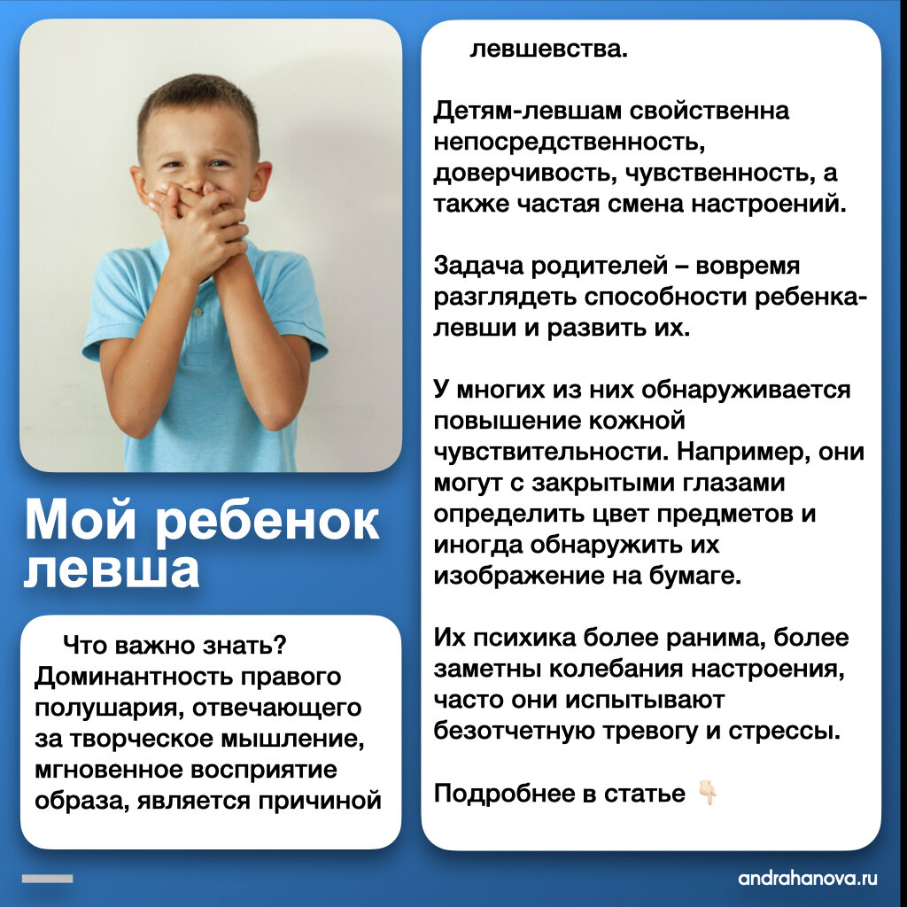 Левши, как правило, обладают более ярким воображением, артистическими наклонностями, способностями к перевоплощению, своеобразным видением окружающего мира. Левшество дает некоторое преимущество в видах спорта, требующих быстрой реакции, — боксе, борьбе, теннисе и др. У праворуких образ воспринимается правым полушарием, а двигательные команды идут от левого полушария к правой руке. У левши всё происходит в одном полушарии, поэтому скорость выполнения движения больше. Знали об этом? Пройдите диагностику в Центре Речи!