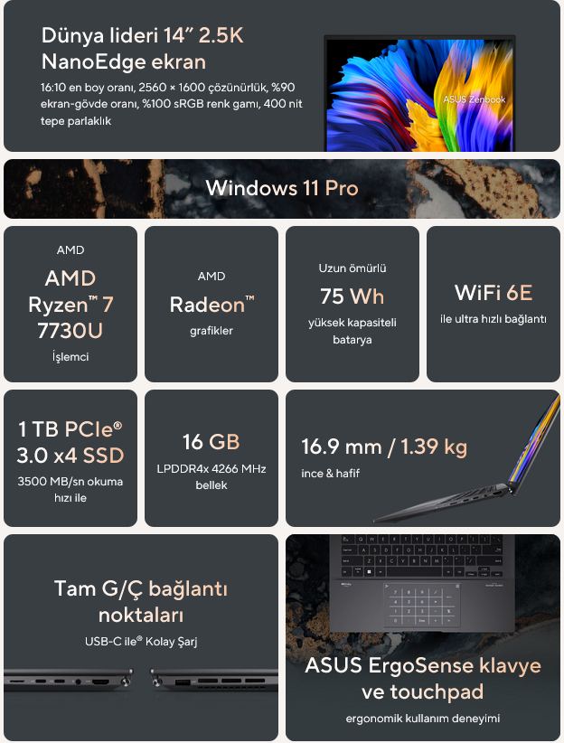 Ноутбуки Ryzen 7000 вскоре должны появиться на рынке, предложив потребителям достойную альтернативу ноутбукам на базе Intel Alder Lake 12-го поколения и ожидаемым устройствам Raptor Lake 13-го поколения, сообщает CyberState. Один из таких ноутбуков уже был обнаружен на странице сайта Asus Turkey. Страница с техническими характеристиками предстоящего ноутбука Ryzen 7000 Zenbook 14, по-видимому, относится к текущей модели Ryzen 5000, но есть несколько упоминаний процессора AMD Ryzen 7 7730U. Однако этот конкретный Asus Zenbook 14 может оказаться не тем ноутбуком на базе Ryzen 7000, которого с нетерпением ждут фанаты AMD. Zenbook 14 предназначен для покупателей, которым нужен тонкий и легкий ноутбук, а не устройство с мощным процессором и видеокартой. Таким образом, такие элементы, как вес и время автономной работы, становятся здесь более важными, и ноутбук оснащен чипом с маркировкой «U», где U классифицируется как часть 15-28 Вт, подходящая для «ультратонких» устройств премиум-класса. Н