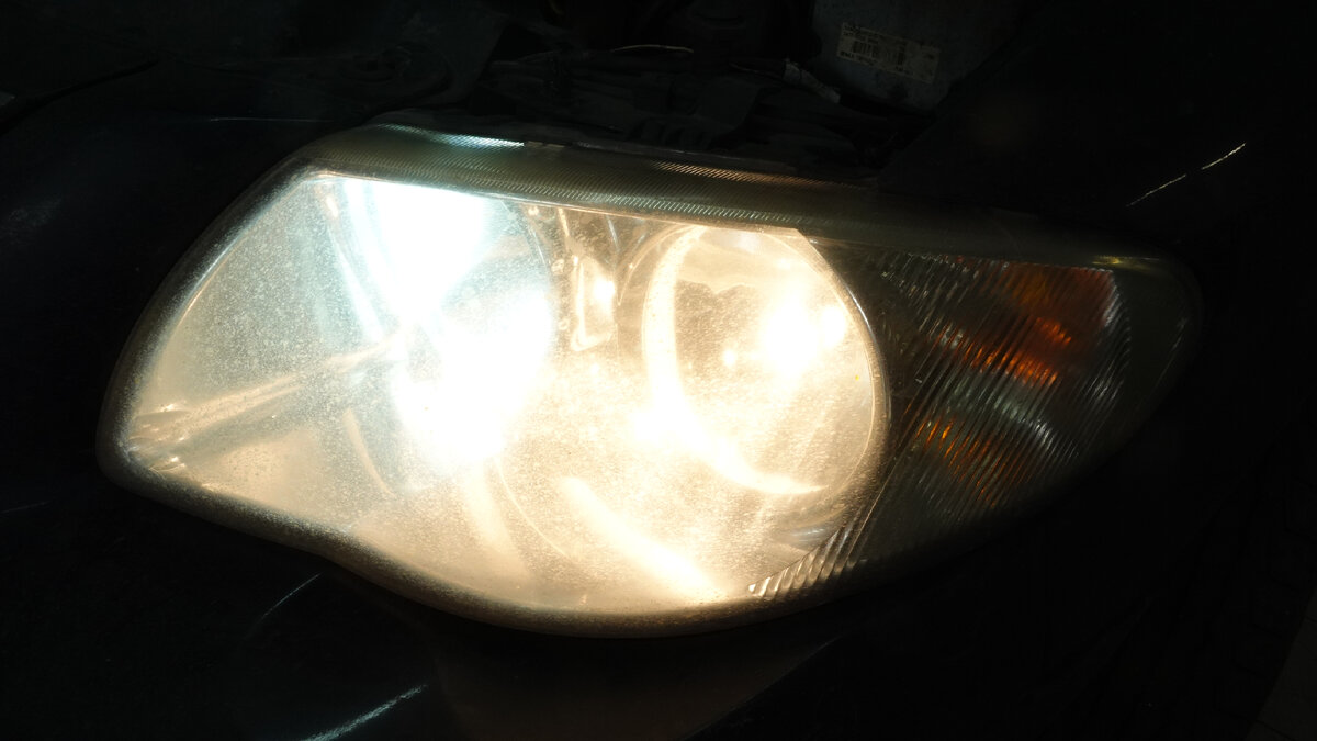 На комплекс по улучшению головного света к нам в студию заехал Dodge Caravan. Штатно на автомобиле установлена рефлекторная галогеновая оптика, которая морально устарела и не дает должного освещения. Из нюансов, при включении дальнего света на авто, отключаются секции ближнего, получается, что в режиме дальнего так же есть недостаток освещения. Стекла фар за годы эксплуатации помутнели, что тоже снижает кол-во света. После осмотра авто, был согласован следующий комплекс работ: Фотографии до начала работ: Расслабляем бампер в центральной его части и демонтируем фары. Частично их разбираем и сталкиваемся еще с одной проблемой… Внутренняя проводка фар пришла в полную негодность. Изоляция рассохлась, оголенные провода были частично изолированы скотчем и синей изолентой. Вот такую крупу из изоляции наблюдаем в корпусах и стеклах после разбора фар. Далее устанавливаем юстировочную плиту и возвращаем фары на автомобиль. Делаем отверстия под шпильки. Далее вырезаем центральную часть отражателя