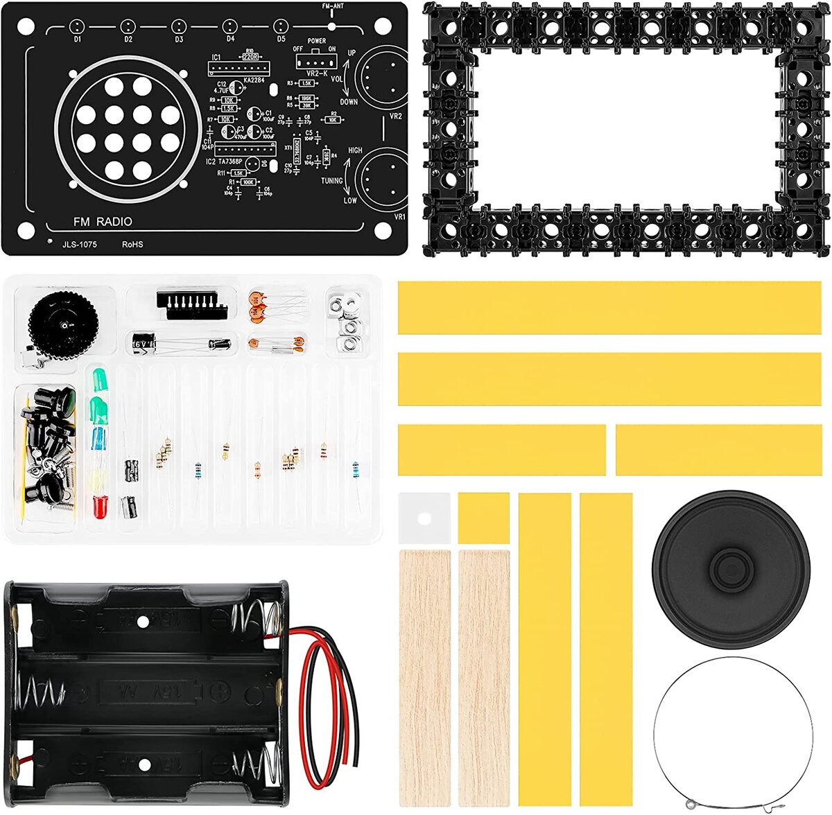 Добрый день дорогие друзья Сегодня мы с Вами продолжим разговор, о том, что можно предложить для сборки начинающему радиолюбителю, начатый на моем канале в предыдущей статье (посмотреть ее можно ЗДЕСЬ) и мы рассмотрим довольно интересный набор для сборки FM радиоприемника продающийся на Amazon за €12,7. Называется набор JLS-1075. Сразу ставлю в известность своих уважаемых критиков, целью данной статьи является не реклама этого набора, а его детальное рассмотрение и изучение, для повторения нашими радиолюбителями схемных и конструктивных решений с этого DIY kit набора Собранный из этого набора FM радиоприемник обеспечивает громкоговорящий прием в диапазоне 64~109MHZ . Питание от трех элементов АА. Вот так набор выглядит при продаже. Перечень деталей входящих в набор. Собирается набор на печаткой плате, которая является одновременно и передней панелью. Плата с обратной стороны, она идет с уже напаянной микросхемой SI4825A10. Плата с обратной стороны, с установленным динамиком и бата