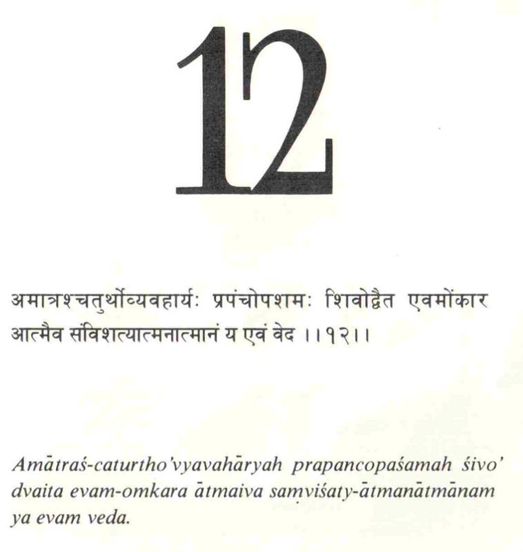 Тот аспект сознания, который неизвестен, является беззвучным аспектом Ом, который не постигается обычным умом и чувствами. Это состояние прекращения всех явлений, даже блаженства. Это недвойственное состояние — одно без второго (адвайта). Это называется четвертым состоянием, а также истинным Я. Тот, кто знает это, расширяет себя до Вселенского Сознания. Беззвучный звук Ом — тишина — имеет ту же природу, что и четвертое состояние, туртия. Турия не имеет частей и непостижима, так как находится за пределами речи и ума. Это состояние реализации, в котором разрешаются все сомнения и конфликты. Это конечное состояние Ом, в которое слились А-У-М. Это недвойственное и блаженное состояние является прекращением влияния великой иллюзии (майи). Оно тождественно Атману, истинному Я всех людей. Тот, кто познал это состояние Абсолютной Реальности, расширяется в Высшее Я, реализует себя как турия и не рождается заново.