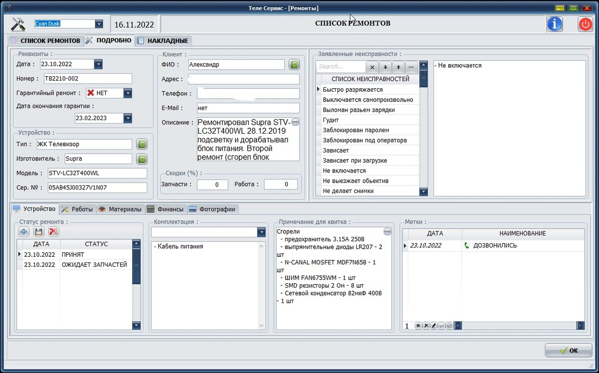 - база данных заметок по ремонту