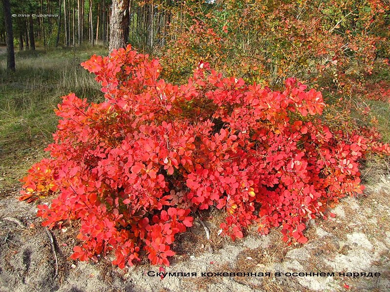 История одного растения. Фенологические наблюдения в национальном парке «Куршская коса» Осенью можно получить самые яркие впечатления от вида сезонной окраски лиственных пород деревьев и кустарников Куршской косы. Кроме того, созревшие плоды даже на безлистных ветках также выглядят очень выразительно и контрастно. Безусловно, лидером по яркости является интродуцент скумпия кожевенная (Cotinus coggygria). Ежегодно ее осенний наряд привлекает внимание. Даже не раз видевшие этот красочный «фейерверк», восхищаются обилием и разнообразием окраски листьев. Осенняя палитра предлагает от лимонно-желтых – до насыщенно-оранжевых, от алых – до пурпурных оттенков. Рисунки же на листьях, связанные с деятельностью насекомых, вообще создают впечатление того, что на кусты опустились тропические бабочки. Ежегодно сотрудники национального парка не перестают отвечать на многочисленные вопросы гостей о ярком и самом впечатляющем наряде осеннего торжества природы. Попробуем еще раз ответить на наиболее рас