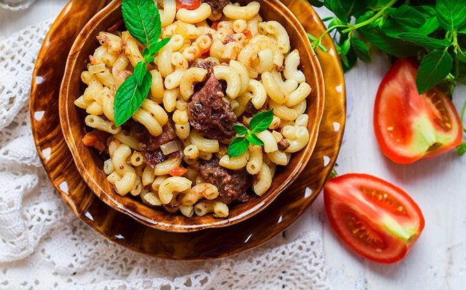Как правильно приготовить такое блюдо, как макароны с тушенкой? Рецепт очень прост, используя его, Вы сможете готовить это блюдо каждый день. А главное после Ваших макарон Ваши домашние просто пальчики оближут. Узнайте, как сделать макароны с тушенкой вкусно, быстро, просто! Макароны по-флотски с говяжьей тушенкой еще один вкус детства, сытное и любимое многими блюдо. Когда требуется что-нибудь быстро приготовить и совсем не требуется какой-то особый кулинарный профессионализм. Ингредиенты Рецепт макарон с тушенкой Шаг 1 — Готовим макароны Первым делом необходимо сначала приготовить наши рожки. Возьмите кастрюлю и вскипятите в ней воду. Как только вода дойдет до кипения, высыпьте в неё рожки. Сразу же перемешайте их ложкой, поднимая со дна, а то прилипнут. Варите их по инструкции, указанной на упаковке. После этого возьмите дуршлак и слейте воду с рожков в течение пяти минут. После этого рожки готовы Шаг 2 — Жарим лук Теперь пришло время готовить зажарку для наших макарон по-флотски с