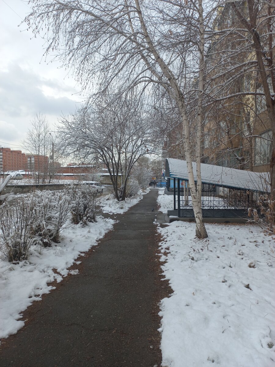 В ночь с 29 по 30 октября в Иркутске выпал первый, по настоящему серьезный, снег. Конечно, он шел раза 2 и до этого, но был мокрый и больше часа на улице не лежал. А сейчас же весь город покрылся белой пеленой. Первый снег - это всегда особое событие. Это смена красок. Наконец то серость и промозглость осени сменяется белоснежностью зимы. Конечно, осень еще будет какое-то время бороться, но начало ее ухода уже положено, и этому можно только порадоваться. Первый снег - это всегда интересное событие. Люди выходят из своих домов на улицу. Дети играют в снежки и пытаются слепить снеговика, взрослые же гуляют и наслаждаются внешним видом города. Именно это можно было наблюдать по всему Иркутску сегодня. В том числе и я, отложив свои дела, решил прогуляться по заснеженному городу и пофотографировать его. Давайте же я поделюсь с вами своими фотографиями Иркутска, украшенного первым снегом. Только вышел из дома и шел мимо ЖК "Петровский". Было пасмурно, недавно снег перест