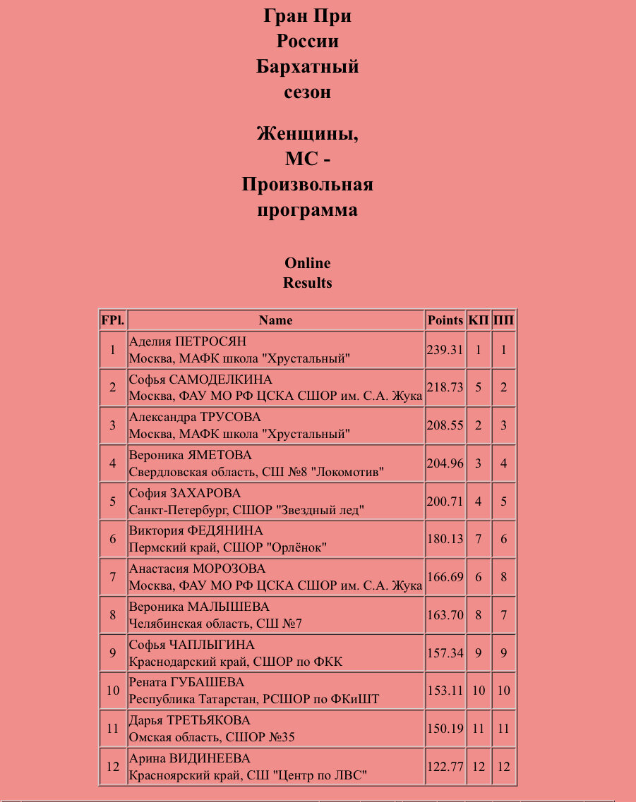 Для женщин завершился второй этап Гран-при России «Бархатные сезоны» и по результатам двух соревновательных дней итоговая турнирная таблица выглядит следующим образом. Софья Захарова. Для Софьи это уже второй этап в этом сезоне. Прекрасная девушка, классная программа, которая очень идет фигуристке. Высокие, модные прыжки. Были помарочки, но обошлось без грубых ошибок. Очень интересная фигуристка! Вероника Яметова хоть и произвольную программу девушка катает второй сезон, она не успела наскучить. Классная фигуристка, мощные прыжки, катание на высокой скорости, много интересных «фишечек» в программе. Здорово, что в Екатеринбурге есть такие сильные фигуристки! Жаль, что не хватило совсем немного до пьедестала…. Александра Трусова вышла на лед с новой произвольной программой. К сожалению, не все удалось сегодня. Было падение с четверного лутца, бабочка на риттбергере( вместо 3-го, получилось два оборота) Потеряла и уровни на непрыжковых элементах. Пока сил не всю программу не хватает: т
