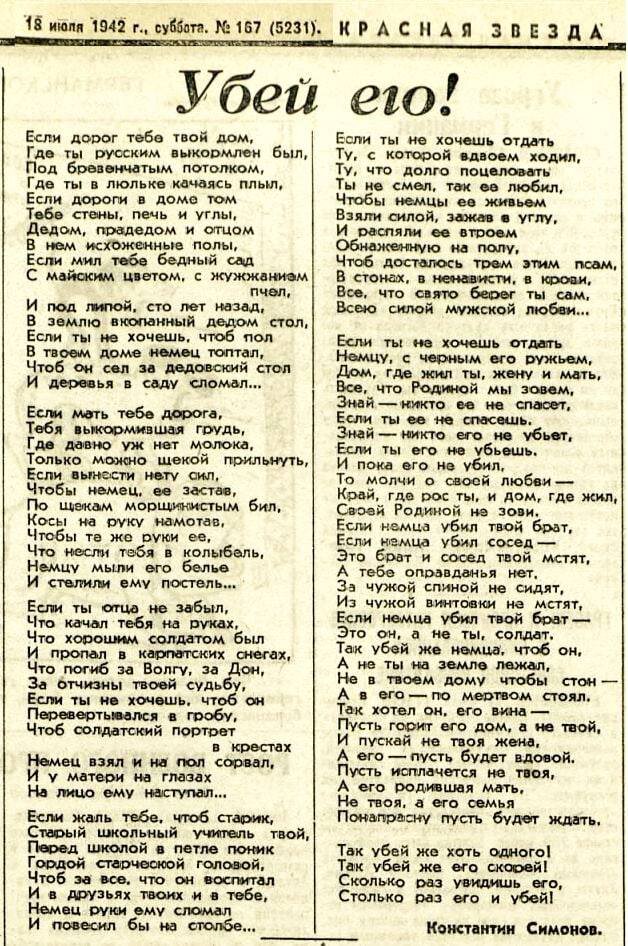 Если дорог тебе твой дом, Где ты русским выкормлен был, Под бревенчатым потолком, Где ты, в люльке качаясь, плыл; Если дороги в доме том Тебе стены, печь и углы, Дедом, прадедом и отцом В нем исхоженные полы; Если мил тебе бедный сад С майским цветом, с жужжаньем пчёл И под липой сто лет назад В землю вкопанный дедом стол; Если ты не хочешь, чтоб пол В твоем доме фашист топтал, Чтоб он сел за дедовский стол И деревья в саду сломал… Если мать тебе дорога — Тебя выкормившая грудь, Где давно уже нет молока, Только можно щекой прильнуть; Если вынести нету сил, Чтоб фашист, к ней постоем став, По щекам морщинистым бил, Косы на руку намотав; Чтобы те же руки ее, Что несли тебя в колыбель, Мыли гаду его белье И стелили ему постель… Если ты отца не забыл, Что качал тебя на руках, Что хорошим солдатом был И пропал в карпатских снегах, Что погиб за Волгу, за Дон, За отчизны твоей судьбу; Если ты не хочешь, чтоб он Перевертывался в гробу, Чтоб солдатский портрет в крестах Взял фашист и на пол со
