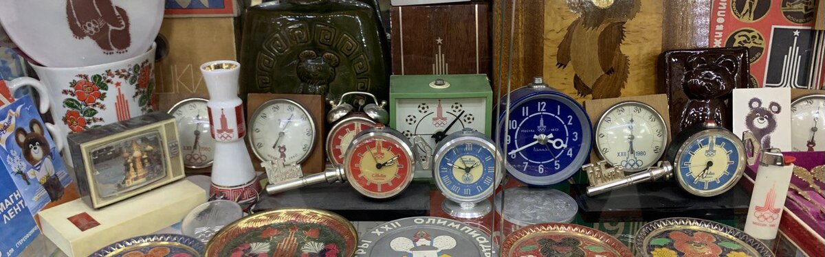 Здравствуйте, горячие сердца! Посетить московский магазин "Сделано в СССР" и уйти от туда с плохим настроением - невозможно! Я провёл там почти два часа и предлагаю вашему вниманию небольшой фотоотчёт. Оказывается, не всё можно там купить! Как сказал мне владелец магазина, он долго и кропотливо собирает артефакты времён СССР, особенно с символикой Московской олимпиады 1980 года, и, если на образце нет цены, значит это экспонат коллекции. Я бы приобрёл такие наручные часы: Порадовала большая коллекция будильников (некоторые продаются). Например, будильник "Пионер". По-моему, завод "Слава" их выпускал. Обратите внимание на безупречное состояние и на отражение в зеркале. Будильник "Слава" сделан в форме глобуса Будильник "Б 84". Если не ошибаюсь, в Ростове-на-Дону собирали из механизмов "Слава" Экспортный вариант с характерным, для шестидесятых, дизайном цифр и корпуса На экспорт уходили и такие, с циферблатом "железная дорога" Довольно редкий представитель Третьего Московского часового з