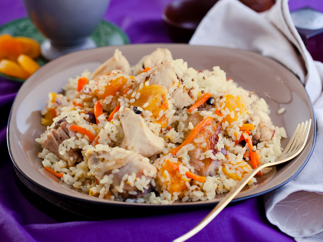 Ингредиенты P.s не обязательно строго следовать рецепту, можно что то убрать или добавить, не бойтесь экспериментировать. Приготовление Шаг №1 Я буду готовить в мультиварке. Приготовим ингредиенты. Шаг №2 Рис тщательно промываем.Курицу вымыть и нарезать небольшими кусочками, удалив все крупные кости (лучше взять филе). Лук и морковь очистить. Лук нарезать тонкими полукольцами, морковь – толстой соломкой. Урюк или курагу промыть горячей водой. Шаг №3 Устанавливаем температуру 160 °С (я устанавливаю таймер на 30м) хорошо разогреть масло и обжарить лук, 5 мин. Добавить курицу и жарить до появления корочки, 10 мин. Положить морковь, перемешать и готовить 10 мин., слегка помешивая. Шаг №4 Добавить зиру и кориандр. Посолить и готовить еще 5 мин. Положить, урюк или курагу, барбарис и острый перец. Готовить 5 мин. Шаг №5 Выложить рис на курицу ровным слоем, влить через шумовку кипяток так, чтобы он покрыл рис сло