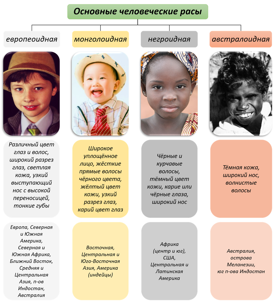 - Различают четыре основные расы: европеоидную, монголоидную, негроидную и австралоидную. Некоторые ученые объединяют негроидов и австралоидов в одну экваториальную расу.