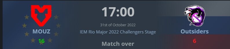Сегодня в Рио стартанул мажор по CSGO. Были сыграны первые 8 матчей стадии претендентов, каждый из которых проходил в формате BO1. Матчами открытия стали Mouz - Outsiders и 9z - Gamer Legion, которые начались в 17:00 по московскому времени. И в той, и в другой встрече команды играли Inferno.