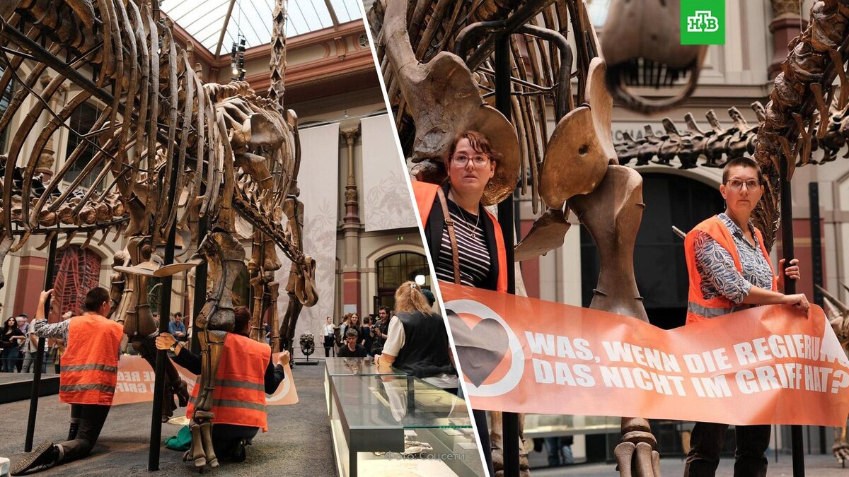 «Мы хотим вымереть или выжить?»: экоактивистки приклеили себя к скелету динозавра в Берлине