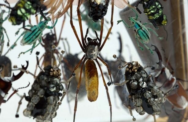 Сумки сочетают в себе традиционную форму и неординарный декор. Прозрачный плексиглас сковывает, подобно льду, настоящих насекомых, а на внешней части им вторят насекомые собранные вручную из бусин, кристаллов, бисера, стекляруса и перьев. Есть что-то волшебное и одновременно жуткое в столь необычном декоре. Дублирование настоящих банановых пауков (самых ядовитых членистоногих в