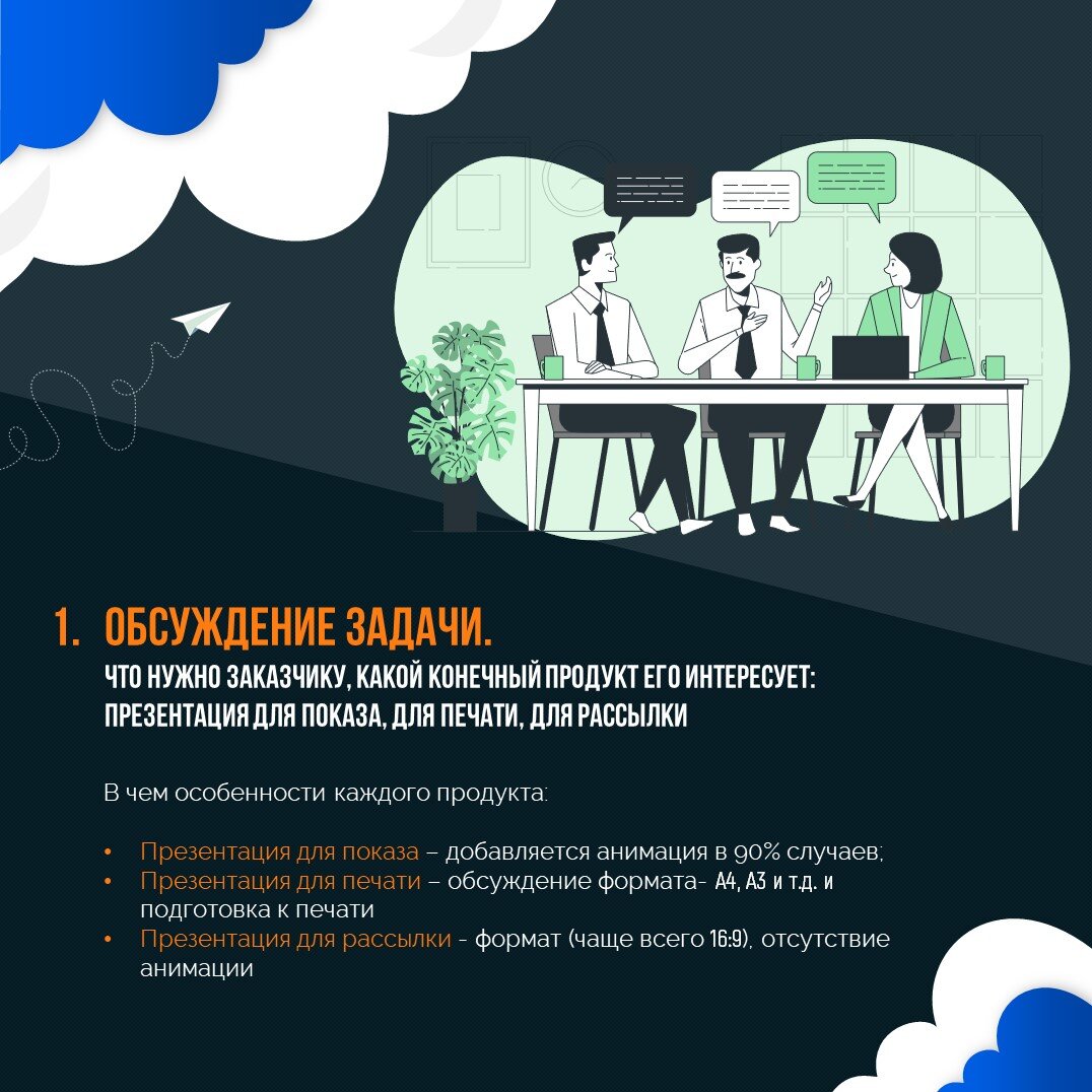 I. Обсуждение задачи II. Наличие материалов III. Брендбук IV. Пожелания заказчика V. Объем работы и условия оплаты VI. Заключается договор, сделка без риска или оплата напрямую VII. Окончание работ