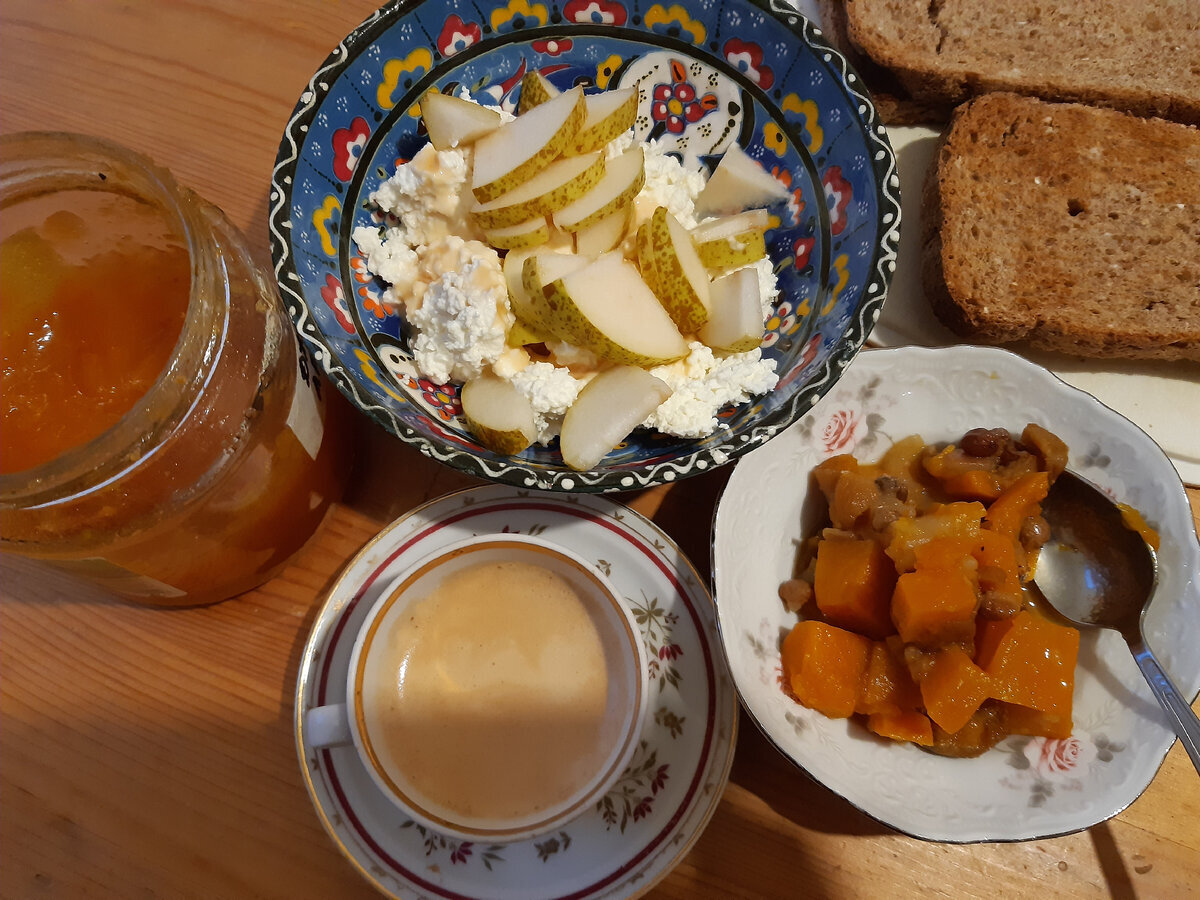 Как обещала, несу вам идеальный рацион по сочетанию БЖУ - мало углеводов (но они есть!), достаточно белка и жира, правильное (для меня!) число ккал - 1450. ЗАВТРАК: Тушеная тыква с яблоком - 100 г, творог 9% - 130 г, кефир 2,5% - 30 г (в творог), груша - 40 г, джем абрикосовый - 20 г (на тост), хлеб житный (из ВВ) - 37 г Можно менять грушу на сливу или яблоко, больших изменений не будет, вместо абрикосового джема взять другой какой-то. Если возьмете менее жирный творог, то и количество калорий тоже будет чуть меньше. Мой завтрак на 399 ккал, БЖУ -25,9/14,8/40,5 г Перекус и обед: йогурт домашний 150 г + джем абрикосовый 35 г 189 ккал, БЖУ 7,7/2,2/34,1 мы с коллегой в этот день делились обедами. Вышло так: гречка отварная 50 г, скумбрия пряного масла (без масла) -78 г, винегрет -150 г, 3 мл масла нерафинированного подсолнечного в винегрет Обед на 312 ккал, БЖУ 15,4/15/9,5 Полдник: чашка эспрессо, конфета инжир в шоколаде 35 г, сыра голубого 15 г, манго 145 г Все на 280 ккал, БЖУ 4,5/9,