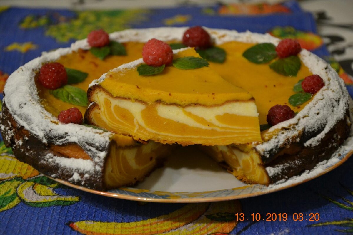 Для приготовления пюре тыкву необходимо запечь в духовке и пробить блендером. Приготовить из перечисленных выше ингредиентов 2 вида теста - творожное и тыквенное, выложить их в форму для выпечки поочередно, как в пироге "Зебра" . Запекать при температуре 180* до сухой зубочистки , достать из духовки, и не вынимая из формы, залить заливкой и поставить в духовку еще на 15 мин. Затем достать, дать полностью остыть и можно резать))