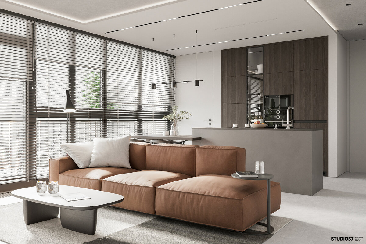 Сегодня рассказываем о стильном дизайн-проекте для молодой современной пары, у которой есть ребенок и любимый домашний питомец - кошка. Ключевыми пожеланиями заказчиков стали отсутствие информационного шума, чистые пустые стены в нейтральной гамме, двери-невидимки размером в потолок. Еще одним пожеланием было отсутствие тяжелых штор и гардин, пришли к полупрозрачным рольшторам в качестве легкой завесы и жалюзи, которые помимо блокировки света дают множество интересных световых сценариев. Заказчики хотели попробовать для себя интерьер с микроцементом на стенах/полах (наливной пол), что бы при этом не было плинтусов, поэтому в проекте мы делали теневой зазор. В помещениях под микроцементом везде размещаются теплые полы - это опровергает миф, что ходить по наливным полам некомфортно как по бетону. Наоборот получается очень "мягкая" приятная фактура. Общая площадь квартиры 71,55 м2, планировка включает в себя такие помещения, как: Объединенное пространство кухни-гостиной - прихожей выпол