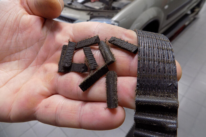 Отказ от дилерского обслуживания в пользу "гаражей" или сторонних СТО – история нередкая. Так поступал и владелец LADA Largus, пока очередь не дошла до планового ТО с заменой ремня ГРМ. Но что-то пошло не так: по истечении небольшого периода времени владелец услышал хлопок под капотом, после которого машина могла передвигаться только на эвакуаторе. В сервисе, где проводилось ТО, машину принять отказались, сославшись на нехватку подъемников. Так автомобиль оказался уже на дилерской станции. "Машину с пробегом чуть более 20 тысяч после последнего посещения гаражной СТО притащили на эвакуаторе, – вспоминает мастер-приемщик. – Такое, особенно с LADA Largus, бывает крайне редко, поэтому, естественно, всех заинтересовала причина поломки". "После разборки и дефектовки было выявлено разрушение ремня привода ГРМ, причем было видно, что сам ремень не старый, – рассказывает мастер, занимавшийся автомобилем. – Характер повреждений был очень интересным: от ремня полностью отделилось несколько з