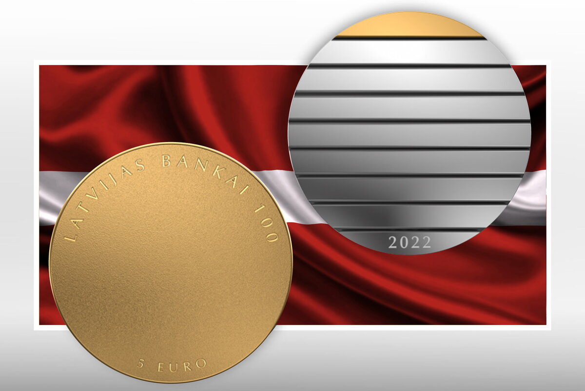 Реверс: Матовая однородная позолоченная поверхность, символизирующая солнце или поверхность озера, отражающую солнечный свет; Вверху по краю надпись: LATVIJAS BANKA 100; Внизу номинал и название валюты: 5 EURO