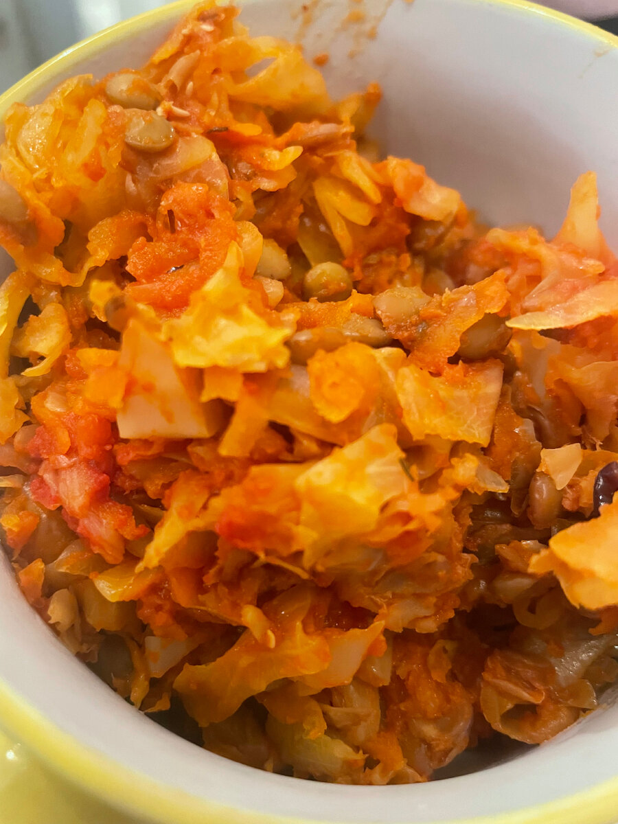 Это наверно самый базовый рецепт, который с одной стороны все знают и когда-то готовили (ну, или пробовали), а с другой стороны у каждого он свой. Здесь будет моя импровизация на тему. Ингредиенты: 1/2 шт Среднего качана капусты 1 шт Морковь крупная 1/4 шт Луковица (если любите лук, берите больше) 1 ст.л Томатная паста 100 гр Чечевица отваренная 1 ч.л Яблочный уксус Соль, приправа универсальная по вкусу Процесс: 1. Луко мелко порезать, морковь натереть и обжарить лук с морковкой на растительном масле 2. Пока овощи обжариваются нашинкуем капусту, добавим к луку и моркови, я готовлю в мультиварке на режиме "Выпечка", солим, добавляем приправу, тушим до мягкости. 3. Добавляем томатную пасту и чечевицу, тушим еще мин 20. Готово.