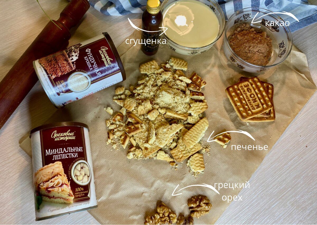 Пирожное "Картошка" - какой-то ностальгический рецепт, когда мама в красивом цветном фартуке "колдует" на кухне, на лице ее улыбка и немного какао, в воздухе вкусный запах ванилина, ее теплые руки лепят самый вкусный десерт на свете, а потом все вместе пьют горячий чай с лимоном и объедаются пирожными!!! Но вот дочка и выросла и уже для своих детей творит на кухне десерты, которые отправляют ее в детство!!! Сегодня мы хотим вам предложить пирожное "Картошка" с фундучной мукой и миндальными лепестками. Орехи -это витамины и микроэлементы, так пусть они как можно чаще будут появляться на вашем столе. Продукты для нашего рецепта простые, недорогие, на приготовление уходит минимальное количество времени, а это ли не самое главное для занятых мам!! РЕЦЕПТ ПРОСТОЙ ПРИГОТОВЛЕНИЕ 15 МИНУТ Берем 300 г любого сахарного печенья, у нас это "Кофе с молоком", измельчаем его скалкой или с помощью блендера. Добавляем в него 100-150 г фундучной муки и 80 г миндальных лепестков ( как они шикарно похру