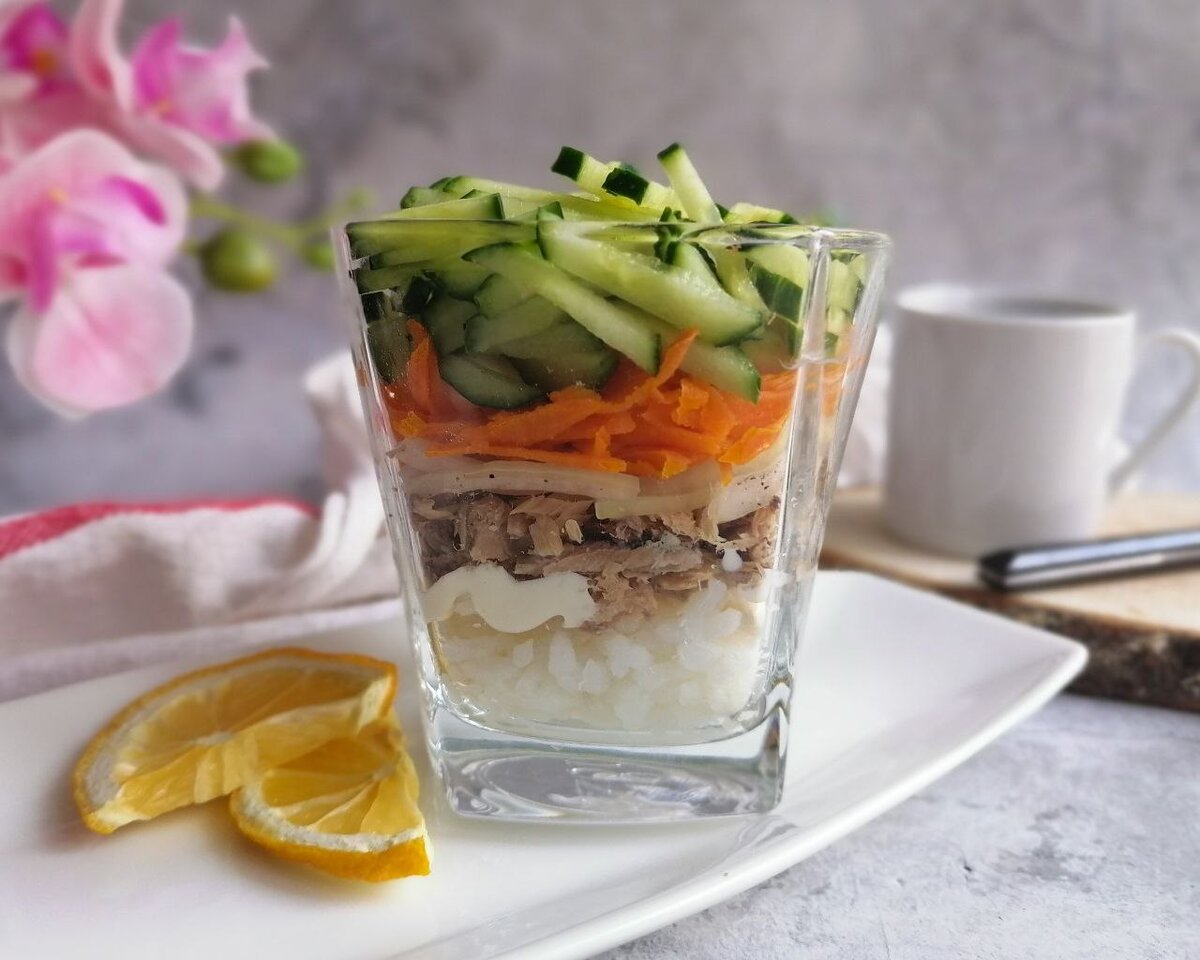 4 слой: морковь (смазать майонезом). Поставить салат в холодильник на 1 час, чтобы он успел пропитаться. Непосредственно перед подачей нарезать огурец соломкой и посыпать сверху на салат. Если огурцы положить сразу, то они дадут сок, и в результате салат станет очень водянистым. Вот такой простой и оригинальный салатик. Приятного аппетита! Ингредиенты 1 стакан отварного риса 1 банка консервированного