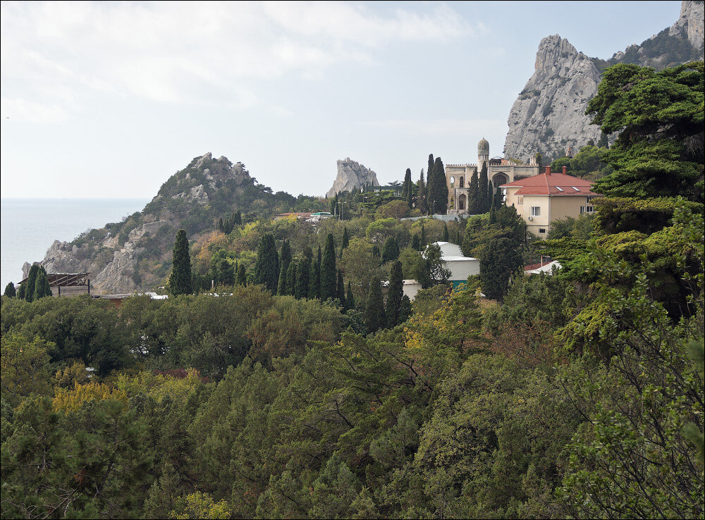 Забегая вперёд, хочется сказать, что у Нарышкинских камней похожего ракурса всё же нет. Но, глядя на фотографии в Сети, думается, что такой ракурс мог бы быть от усадьбы бывшего главы Администрации президента Украины Виктора Медведчука, построенной на месте ликвидированного в 2004 году противотуберкулёзного санатория им.Баранова. Нынешнее здание даже немного напоминает картинное. Старых фотографий санатория найти не удалось, но хозяин картины когда-то очень давно лечился в Крыму в одном из таких санаториев, и это вполне могло быть в Симеизе!