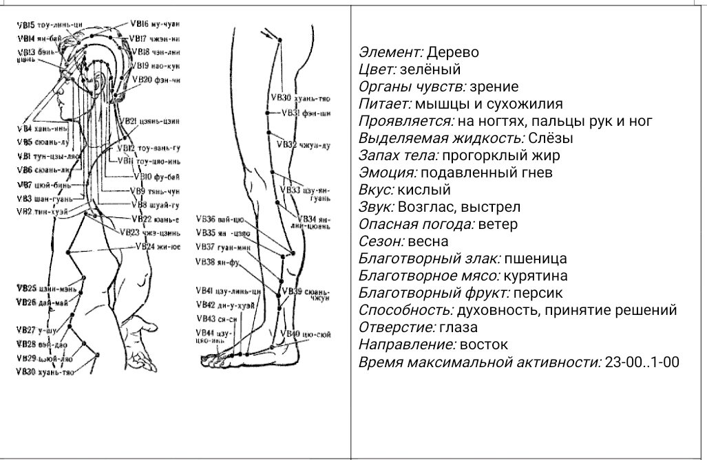 Горечь во рту, шум в ушах, боль в боку, припухлость щёк, шеи и подбородка, заболевания горла, головная боль, судороги ног- всё это говорит об избытке в меридиане жёлчного пузыря. При Недостатоке энергии: человек ощущает слабость, нет энергии и сил, припухлость в подколенной ямке, в области стопы, отёчность суставов ног, ночная потливость, желтушность склер, тяжёлые вздохи, головокружение, бессонница, грязный слизистый налёт на языке Питает: мышцы и сухожилия Проявляется: на ногтях, пальцы рук и ног Эмоция: подавленный гнев, бравада. Когда человек много злится, нервничает, то у него страдает желчный пузырь и печень. Благотворный злак: пшеница Благотворное мясо: курятина Благотворный фрукт: персик Способность: духовность, принятие решений Отверстие: глаза. Желчный пузырь открывается в глаза. Если глаза желтеют, то это говорит о нарушениях в желчном пузыре и печени. Падает зрение, болят глаза- обратите ваше внимание на желчный пузырь! Если статья понравилась, не забудьте подписаться