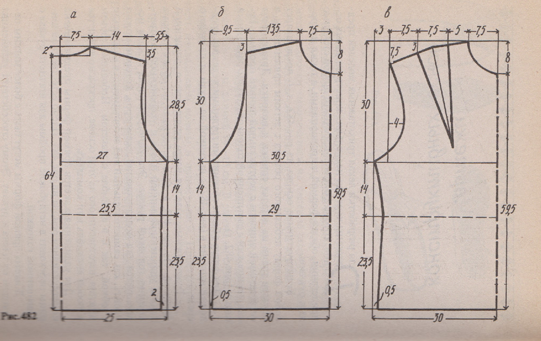 Если изделие прямое, с обычным рукавом, то рис. 484, с увеличенной проймой и немного спущенным рукавом рис.485: