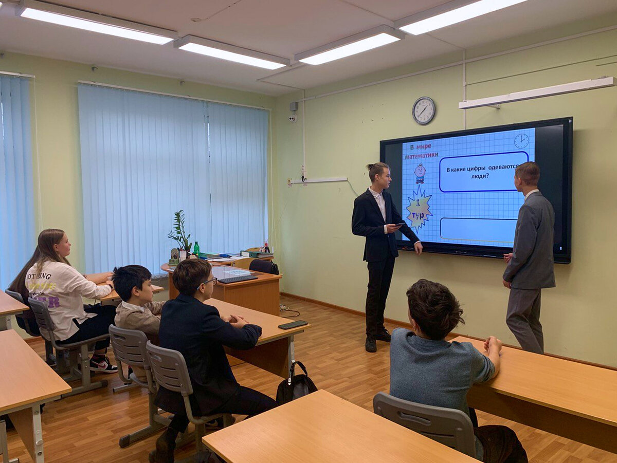 "Математическая вертикаль" - городской образовательный проект, целью которого является многоцелевая предпрофильная подготовка по математике и смежным областям. "Обучение в проекте "Математическая вертикаль" ведется по инновационной программе, призванной обеспечить многоцелевую предпрофильную подготовку школьников 7-9 классов по математике и смежным областям. В рамках проекта школьники изучают современный курс математики, посещают кружки, факультативы по математике и IT. Математическая игра "В царстве математики" состояла из 5 туров. Задачи, которые были предложены учащимся, были направлены на применение знаний по математике и на развитие логического мышления в игровой форме. Цель данного мероприятия - развитие познавательного интереса и интеллекта. Такие игры направлены на развитие интуиции и математических способностей учащихся. В ходе игры ученики 7 "М" класса узнали от старших ребят из 9 "М", что такое "математические" растения и в какие цифры "одеваются" люди. Кроме того, ребята