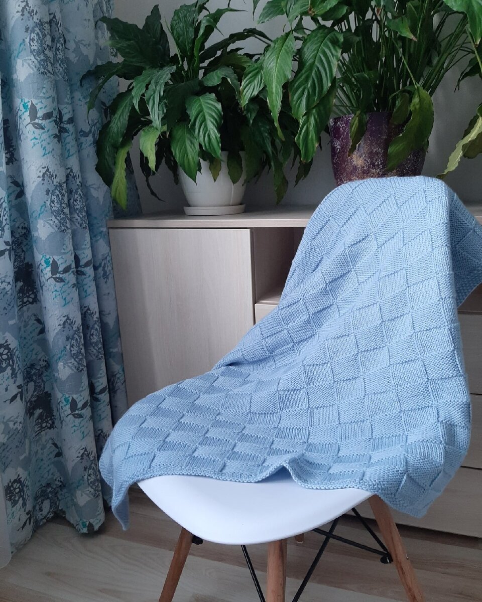Вяжем из любой пряжи. Я вязала из 100% мериноса, 1500/100 в 8 нитей (188 м на 100гр). Кромки на спицах 4, основное полотно на 4,5. Набираем любым удобным способом 172 петли (170+2 кромочные). 7 рядов провязываем узором “рис” (1 л, 1 изн, до конца ряда, следующий ряд меняем местами петли 1 изн, 1 л, до конца ряда) Затем делаем распределение на узор: 1кр, 5 петель рис, далее 10 л, 10 изн - 16 квадратов получается, 5 петель рис, 1 кр. Для красивой кромки первую петлю в лицевом ряду снимаем, последнюю провязываем изнаночной. В изнаночном ряду первую петлю снимаем, последнюю провязываем лицевой. Квадрат состоит из 10 рядов, то есть 10х10. Узор сильно сжимает полотно, учитывайте это для размеров итоговых. Вяжем любое количество рядов. В моём случае это 23 квадрата в высоту (90 см ориентир) Далее берём спицы 4 и снова вяжем 7 рядов узором “рис” и закрываем полотно. Я закрывала способом набрасывания петли на предыдущую. Общий вес 440 гр, размер 90х90 см. Если взять кардную пряжу, то расход буд