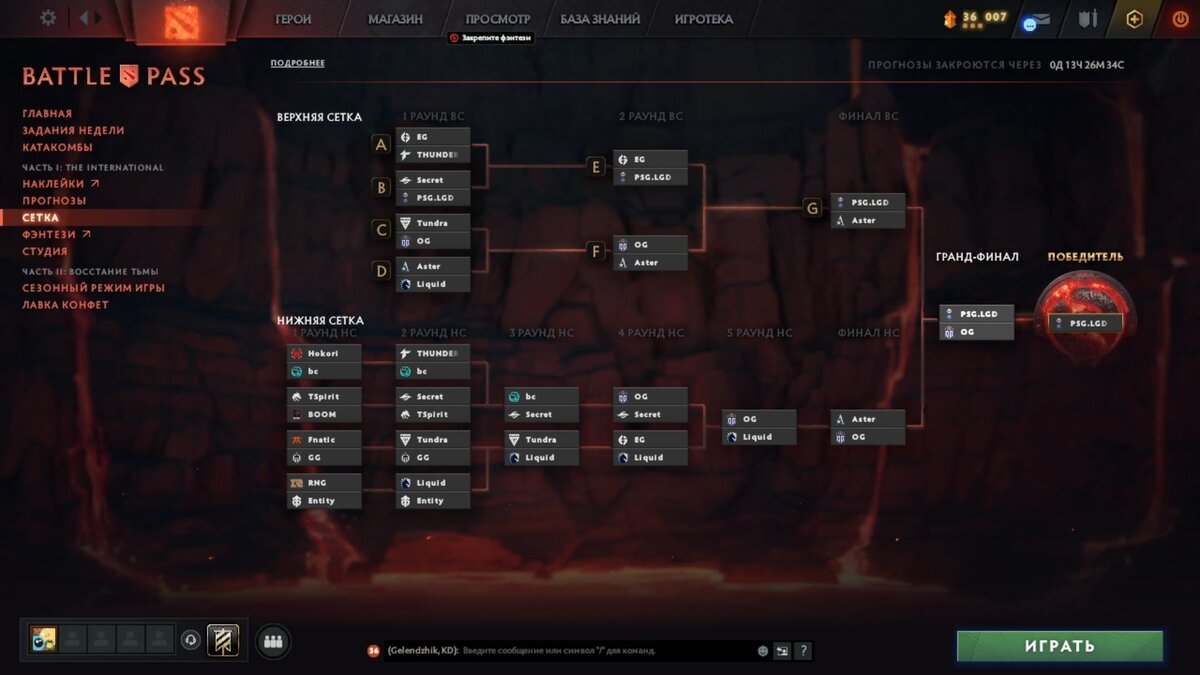 За день до старта плей-офф The International 2022 в боевом пропуске Dota 2 открылись прогнозы на сетку решающей стадии турнира. Владельцы TI11 Battle Pass могут предсказать итоги всех матчей плей-офф и получить за это уровни боевого пропуска. Мы традиционно публикуем свою версию прогнозов. Выставить в боевом пропуске в клиенте Dota 2 свою версию сетки можно до старта первого матча — 20 октября 5:00 по мск. Награды за предсказания сетки в Battle Pass 2022 Разумеется, предсказать итоги всех 22 матчей плей-офф нереально. Но попытаться стоит, ведь даже в случае, если вы угадаете пару исходов, можно бесплатно получить очки боевого пропуска. Если же верно предсказать большую часть сетки, можно поднять 20 уровней T11 Battle Pass. Сетка The International 2022 для Battle Pass — прогноз от CQ Мы рекомендуем ставить на фаворитов, поэтому в нашей версии PSG.LGD уверенно побеждает всех соперников и побеждает на The International. Китайская команда и впрямь очень сильна, поэтому хотя бы часть этих п