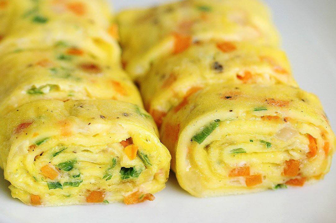 Ингредиенты: • яйцо – 3 шт. • морковь – 1/2 шт. • растительное масло– 5 г. • сыр, помидоры, зелёный лук – по вкусу Приготовление: 1. Яйца взбиваем венчиком. Морковь, сыр, помидоры и зелёный лук очень мелко нарезаем. Смешиваем с яйцами. В разогретую сковородку добавляем масло. 2. Выливаем тонкий слой омлета, как блинчик. Когда омлет немного «прихватился» сворачиваем, как рулет. 3. Отодвигаем остальную часть рулета в сторону и к открытому краю добавляем ещё немного яичной массы. 4. Продолжаем пока не закончится яичная масса готовим яичный рулет. #от1года #завтрак