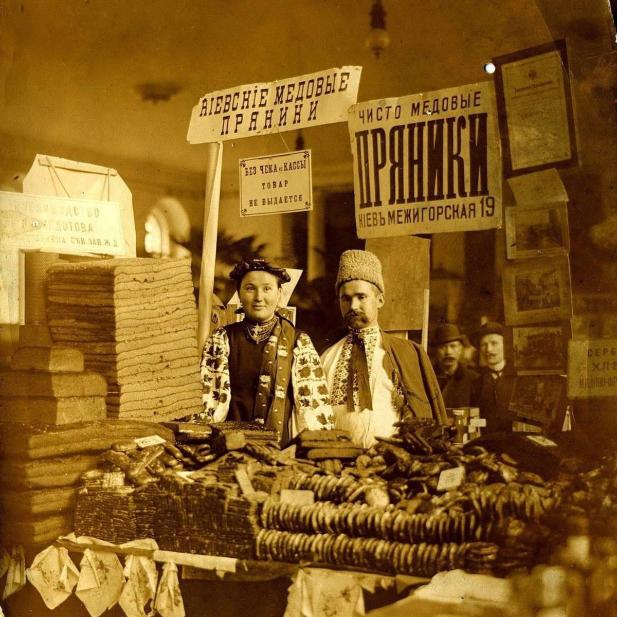 Гигантские то ли коврижки, то от пряники в левом углу. Сейчас такой размер, вообще, делают ?… PS И какая антуражность. Костюмчики малороссийские :3 🔸 Торговля медовыми пряниками из Киева, 1910 г. 🔹Пряничное дело 📍Киевская губерния #лр_быль И ещё заметка: обратите внимание на табличку над головой девушки. Там нет еров (ъ). В целом, реформа орфографии обсуждалась уже давно к тому времени, но случится только при Временном правительстве. Возможно, эта табличка - свидетельство какого-то внутреннего народного процесса по отказу от бесполезных с практической точки зрения еров.