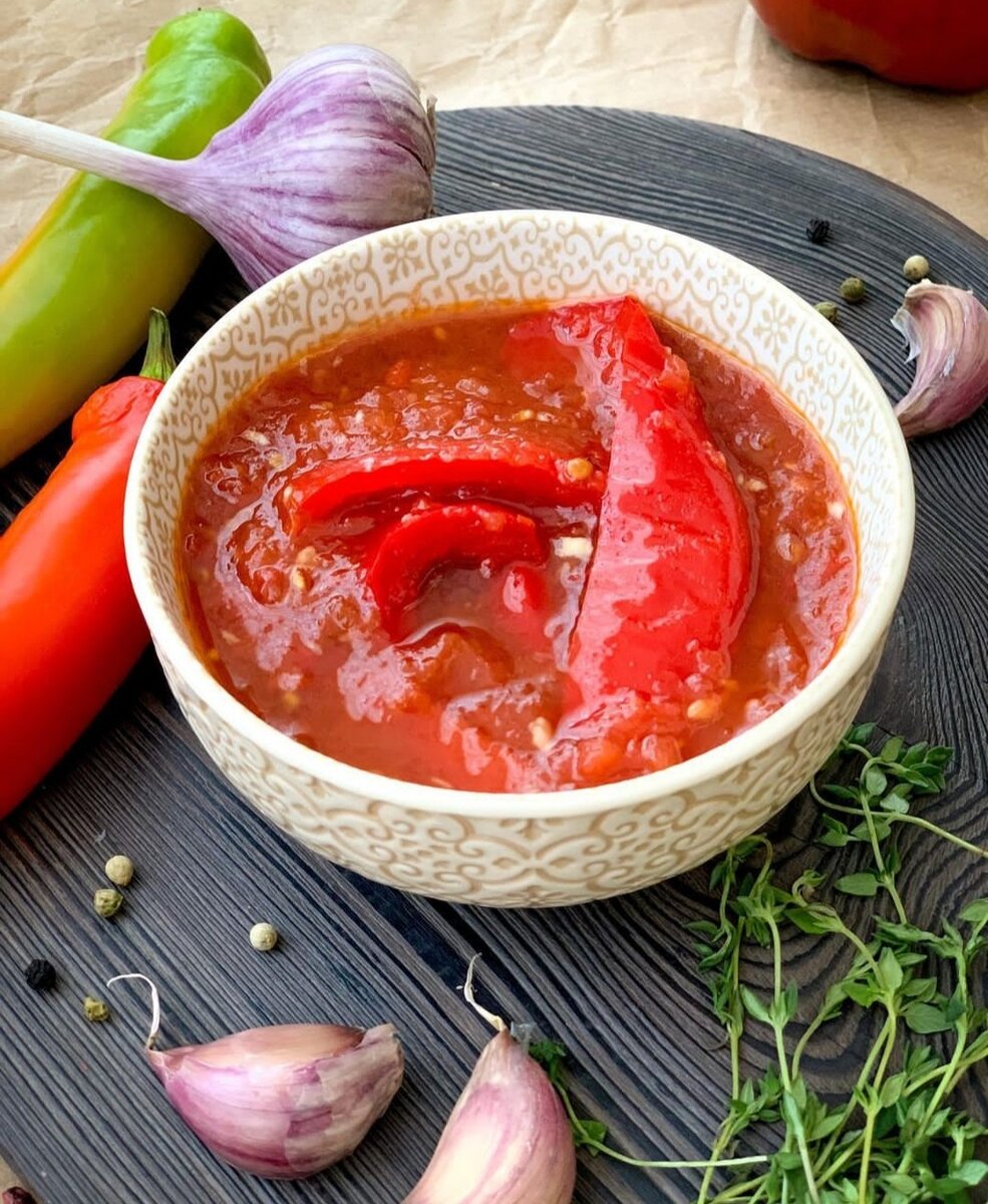 Привет, друзья ! Сегодня хочу поделиться с вами очень вкусным рецептом закуски, ему уже много лет, передаётся из поколения в поколение, и почему - то её всегда мало)) ИНГРЕДИЕНТЫ : Помидоры - 3 кг, Перец острый - 1-2 стручка, Перец болгарский - 1 кг, Чеснок - 1 головка, Соль - 2 столовые лодки с горкой, Сахар - 1 столовая ложка, Уксус 9% - 6 столовых ложек . ПРИГОТОВЛЕНИЕ : 1) Помидоры прокручиваем в мясорубке и ставим томиться на самый медленный огонь 1,5 часа . 2) Болгарский перец очищаем от семян и плодоножек, нарезаем крупной соломкой . 3) Горький перец и чеснок измельчаем в блендере или мясорубке . 4) В кастрюлю к помидорам кладём всё, кроме уксуса, перемешиваем и томим ещё минут 30 . 5) Заливаем уксус, перемешиваем и горячим заливаем в стерильные банки . Закрываем кипячёными крышками . Закуска готова ! Приятного аппетита ! #закуска #остраязакуска #помидорнаязакуска #вкусныерецептысфото #рецептыеды #готовитьлегко #вкусноготовим #вкуснои
