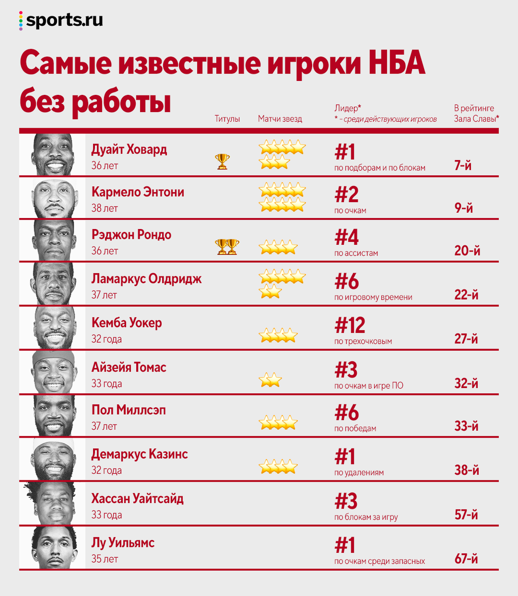 Мело, Дуайт, Кемба – вне лиги. В НБА больше 500 рабочих мест. Но в заявках 30 клубов на старте нового сезона не хватает нескольких привычных и всем знакомых имен. Вот 10 самых заметных баскетболистов, пока не объявлявших о завершении карьеры, у которых до сих пор нет контракта на сезон-22/23: