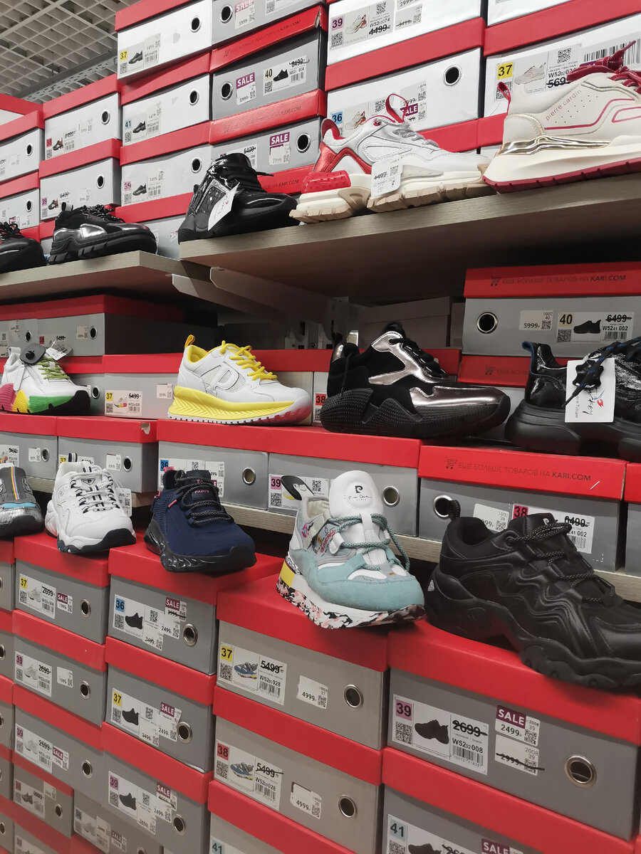 Нижний ряд мог бы быть бюджетным, подвела одна пара - та, что в зелёном цвете, ибо стоит она 4999 рублей вместо 5499. Остальная обувь в ряду стоит 1999-2499 рублей. В самом верху есть красно-белые кроссовки за 2999 рублей вместо 4499 (неплохая скидка), все остальное, что осталось на фото, дорогое - более 4 тысяч с учётом скидки. Я бы столько не хотела тратить в "Кари".