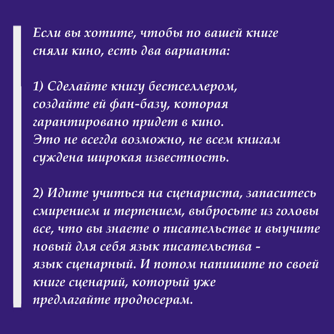 Александр, здравствуйте). Благодарю вас за марафон "Год Денег", я как минимум пишу практически каждый день, почему деньги ко мне текут легко и радостно и эта замечательная привычка, и другие задания тоже смотрю и беру на вооружение. Благодарю вас за вклад в моё обогащение и рада быть вкладом в ваше). Хочу задать вам вопрос, может быть, вы захотите на него ответить публично. Думаю, что это не только мой вопрос. Вопрос такой. Я писательница. На сегодня у меня издано пять книг, есть продюсер по серии детских сказочных, раскрывающих предназначение ребёнка, книг. В сфере детской книги я спокойна - рост и расширении аудитории и продаж идут. Но у меня так же есть действительно хорошая и качественная книга для взрослых. Я хочу, чтобы она стала известной на российском уровне и понимаю, что для этого нужно снять по книге кино. Мой вопрос. Как мне найти сценариста, режиссёра, продюсера для реализации моей цели? И с кого именно нужно начинать свои поиски? Со сценариста или именно с продюсе