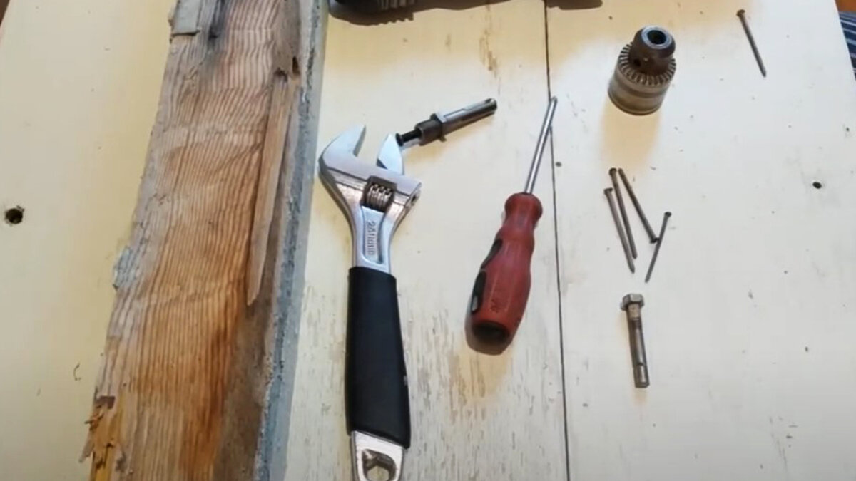 Приветствую, дорогие друзья. В сегодняшнем эксперименте будем проверять, действительно ли с помощью перфоратора у нас получится забить гвозди. Для этого мы используем один из лучших вариантов насадки, который есть в сети. Для её изготовления нам понадобится: ·насадка для забивания гвоздей, ·разводной ключ, ·отвёртка, ·гвозди, ·патрон для перфоратора, ·переходник с перфоратора на патрон дрели (хвостовик), ·брусок для испытаний. Для изготовления этого приспособления нам подойдёт патрон от старой дрели, чтобы не было жалко даже когда поломается. Затем берём переходник (подойдёт от обычного набора) с перфоратора на патрон дрели. Нам останется немного подтянуть гайку и закрутить болт. Дальше нам нужно изготовить набивную насадку. Для этого подойдёт обрезок болта. Достаточно отрезать шляпку и навернуть на него гайку, до конца закручивать не нужно, нам понадобится место для того, чтобы шляпка от гвоздя свободно помещалась в этот промежуток и таким образом направляла движение гвоздя, чтобы он