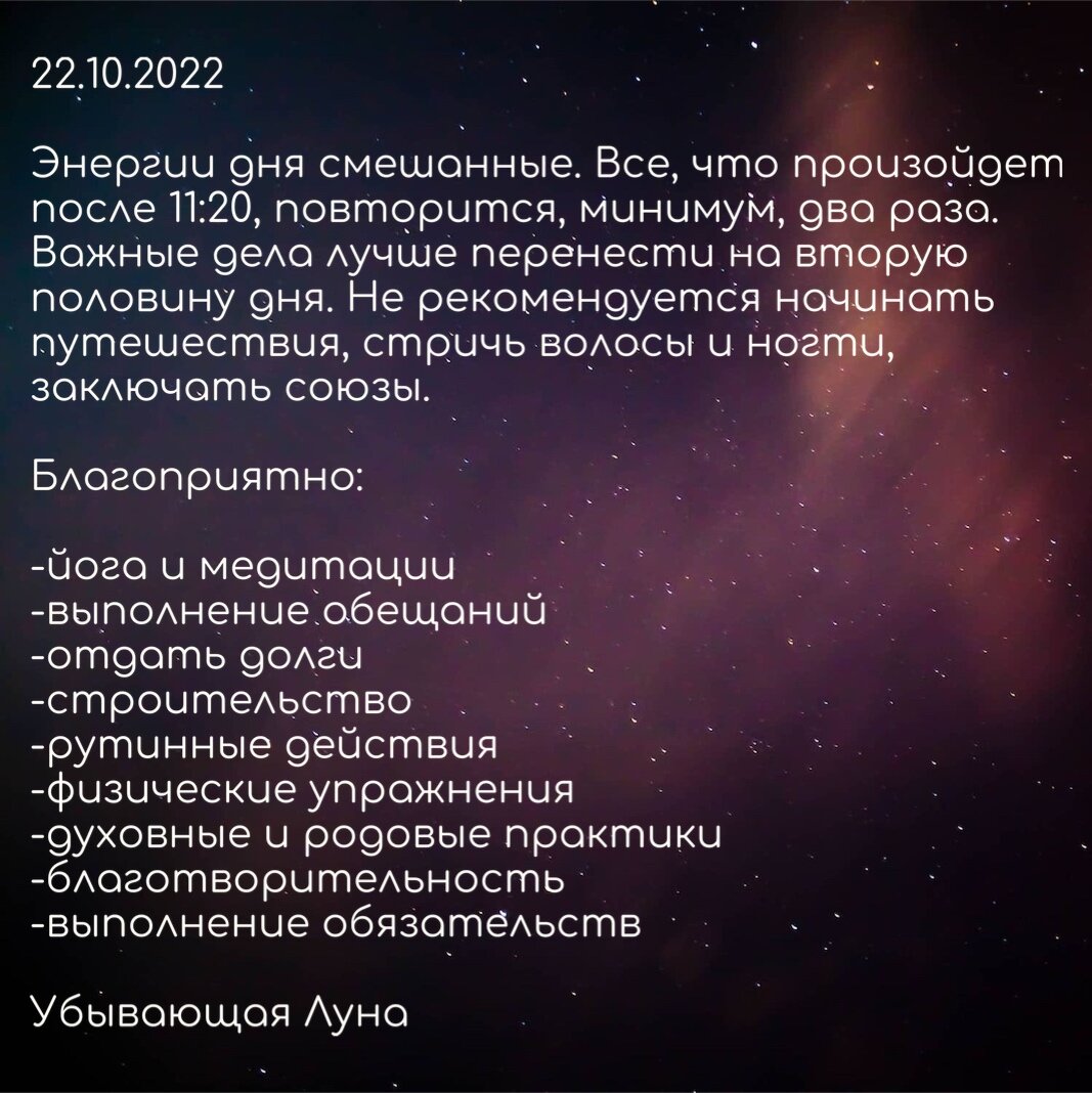 Энергии дня смешанные. Все, что произойдет после 11:20, повторится, минимум, два раза. Важные дела лучше перенести на вторую половину дня. Не рекомендуется начинать путешествия, стричь волосы и ногти, заключать союзы. Благоприятно: -йога и медитация -выполнение обещаний -отдать долги -строительство -рутинные действия -физические упражнения -духовные и родовые практики -благотворительность -выполнение обязательств Убывающая Луна #дарьяvidvas #астрологический прогноз #астрологический прогноз на неделю #астрологический прогноз на сегодня #астрологический прогноз на день #астрологический календарь