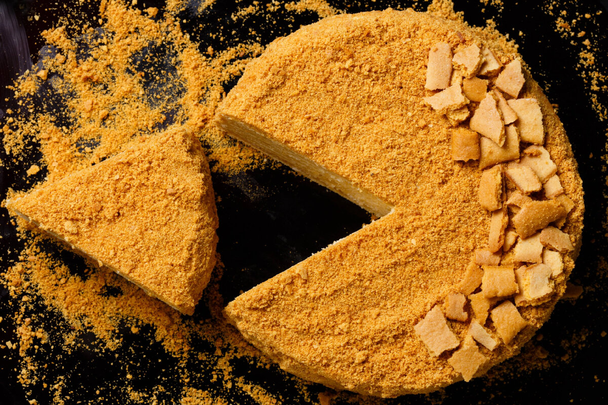 Обычно десерт украшается крошкой, который остается при формовке коржей. При желании можно присыпать ее в форме сот. В некоторых случаях торт дополняют орехами, свежей ягодой или фруктами. В общем десерт всегда можно импровизировать по-своему.