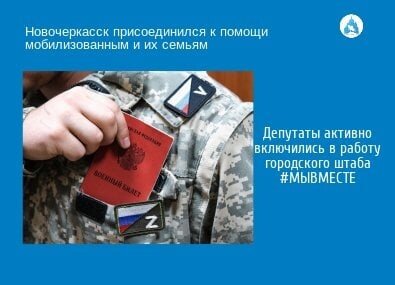 «Сейчас важнейшая миссия лежит на наших волонтерах и городской штаб #МЫВМЕСТЕ её успешно выполняет. Я, как член штаба, могу сказать, что мы реагируем на все просьбы семей мобилизованных, стараемся помочь во всем. Если вы или ваши знакомые нуждаются в нашей помощи и поддержке в связи с частичной мобилизацией родственников городской штаб #МЫВМЕСТЕ и мы – депутаты готовы их оказать», - рассказал глава города.