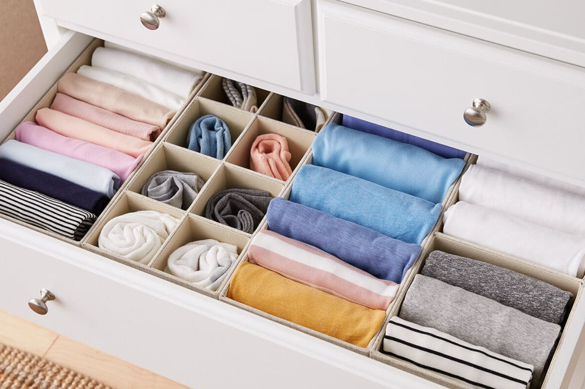 Наверное, каждая из вас сталкивалась с тем, что не может что-то найти в шкафу с вещами. При этом поиски заканчиваются тем, что перерыв весь шкаф/ящик/полку приходится тратить время на то, чтобы все сложить обратно. Согласитесь, это крайне неудобно, ведь вы тратите при этом свои время и силы. Чтобы избежать подобных ситуаций, предлагаю попробовать вертикальный способ хранения вещей. При этом варианте вещи не кладут сверху друг на друга привычными всем стопками, а укладывают вертикально. Этот способ позволяет видеть абсолютно каждую вещь, при этом её можно достать без особых усилий, не нарушая всю стопку вещей. Здесь ещё важен момент расхламления, то есть вам сперва нужно будет перебрать всю одежду и избавиться от ненужной, оставив только ту, которую вы действительно будете носить. После того как переберете вещи, можно приступить к их сортировке. Лучше разделить их на категории и хранить носки с носками, нижнее белье с нижним бельём, штаны со штанами и т.д. Тем самым вы будете знать, где