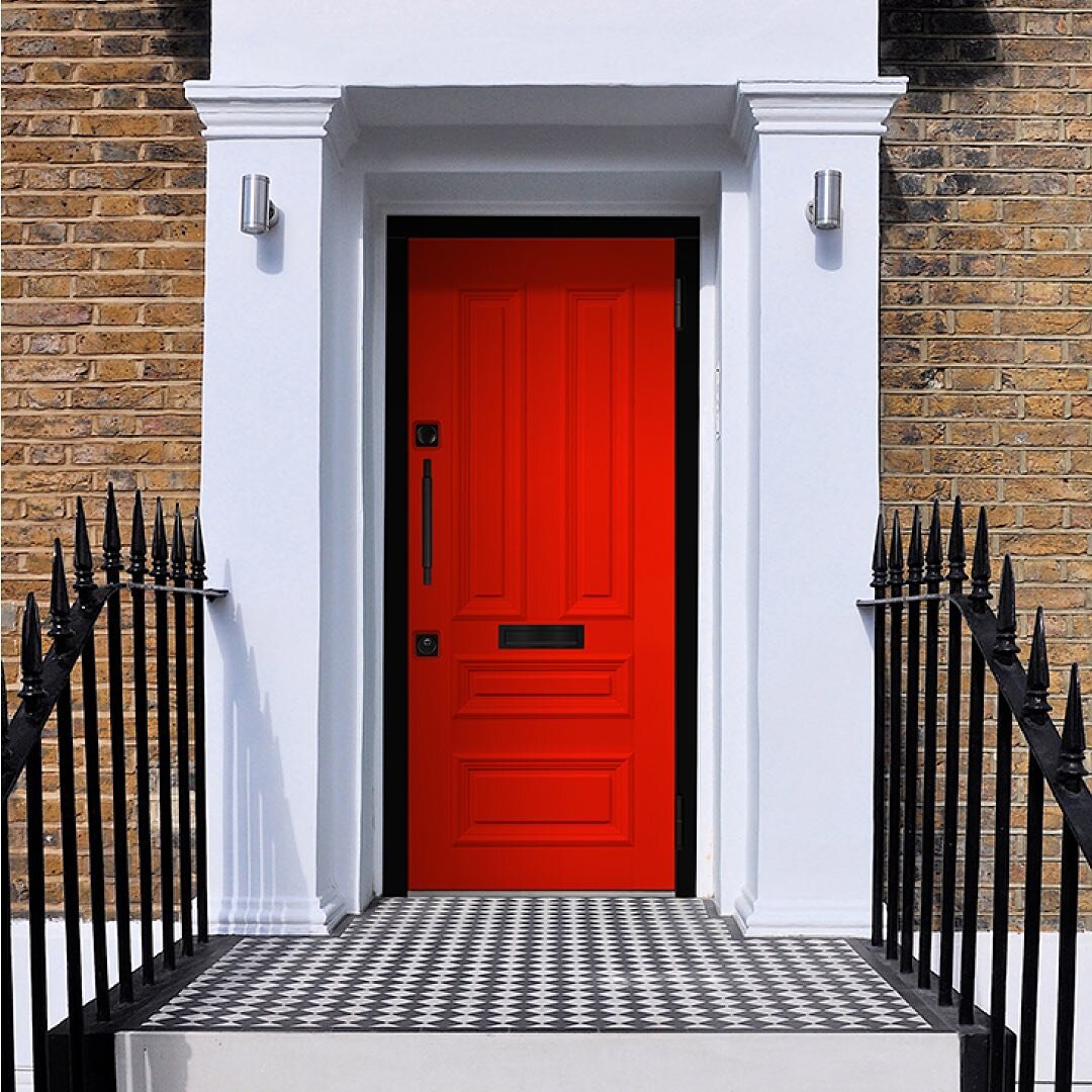 Чтобы визуально отделить зону прихожей и обозначить вход в квартиру, выбирайте дверь в одном оттенке со стенами. Необычное решение — тёмная дверь с покрытием SteelLak, квадратной фурнитурой и вставкой из чёрного глянца.