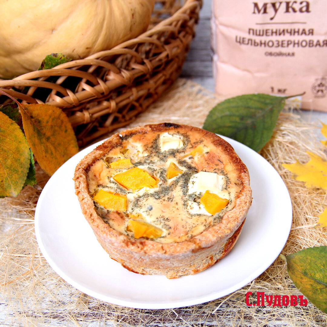 Осенью в холодильнике обязательно найдётся тыква. Держите прекрасный рецепт маленьких открытых пирогов с тыквой. Они получаются сытными, ароматными и очень вкусными. Такие пироги обязательно удивят близких и гостей, такого они точно не пробовали! Тесто: Мука пшеничная хлебопекарная в/с С. Пудовъ - 150 г Мука пшеничная обойная Цельнозерновая С.Пудовъ - 150 г Соль морская натуральная пищевая, мелкая (помол №0) Marbelle - щепотка Охлажденное сливочное масло - 150 г Твердый сыр - 100 г Яйцо - 1 шт. Заливка: Сливки - 150 мл Яйца - 5 шт. Твердый сыр - 30 г Тыква - 120 г Оливковое масло - для запекания тыквы Сыр фета - 100 г Лук - 1 шт. (небольшой) Укроп сушеный С.Пудовъ - по вкусу Горчица желтая в зернах С.Пудовъ - по вкусу Приготовление: 1. Соедините муку с солью и порезанное небольшими кубиками охлажденное сливочное масло. Перетрите до состояния однородной крошки. 2. Добавьте сыр и яйцо. Замесите однородное тесто. Оберните тесто в пищевую плёнку и уберите в холодильник на 30 минут. 3. Смаж