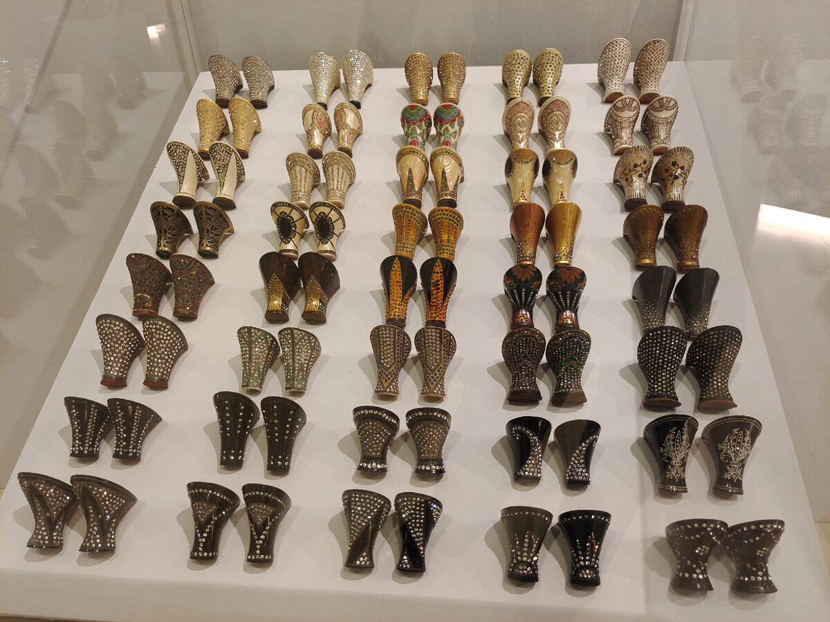 Каблучки, представленные отдельно от туфель - это мой самый девочковый "Ах!" со всей выставки! Это не сменные каблуки, это на выбор. Когда богатая модница заказывала обувь по индивидуальному размеру, в момент обсуждения дизайна туфель, она могла выбрать к ним каблуки с разным декором. Потом каблуки у туфель уже не менялись. Основа для каблуков делалась из дерева, а дальше начиналось волшебство: вместо используемой в предыдущие века кожи, каблук обтягивался новым материалом - целлулоидом. Он был пластичным, мягким и благодаря добавкам мог имитировать дорогие материалы (слоновая кость, перламутр, коралл, бронза, фарфор, черепаховый панцирь). А нарядность каблучкам придавал декор. Причём техники украшения были схожи с ювелирными. Главная роль в декоре принадлежала всевозможным стразам, сияющим, словно звёзды, упавшие к ногам красотки. Не такой громкой, но зато элегантной отделкой могли похвастаться каблуки из латуни. На них мастера создавали ажурный декор, похожий на кружево. Словом